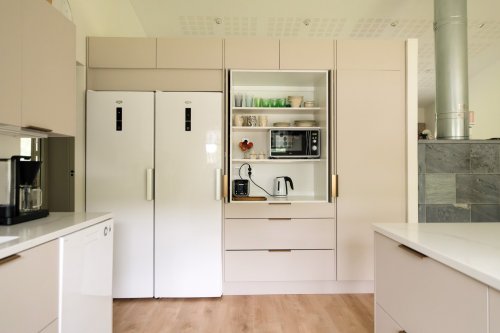 Uusi keittiö on kaunis. Aamiaiskaappi piilottaa keittiön pienkoneet.